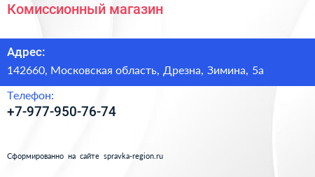 Комиссионный магазин по адресу 142660, Московская область, Дрезна, Зимина, 5а в дальнейшем Организация, размещена в следующих категориях: