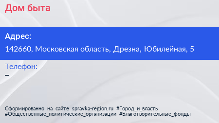 Дом быта по адресу 142660, Московская область, Дрезна, Юбилейная, 5 в дальнейшем Организация, размещена в следующих категориях: