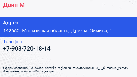 Двин-М по адресу 142660, Московская область, Дрезна, Зимина, 1 в дальнейшем Организация, размещена в следующих категориях: