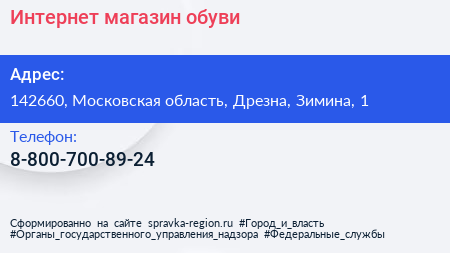 Интернет-магазин обуви по адресу 142660, Московская область, Дрезна, Зимина, 1 в дальнейшем Организация, размещена в следующих категориях: