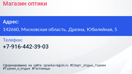 Магазин оптики по адресу 142660, Московская область, Дрезна, Юбилейная, 5 в дальнейшем Организация, размещена в следующих категориях: