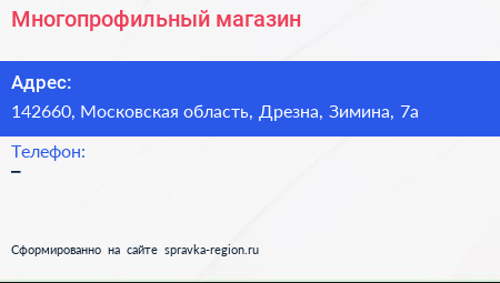 Многопрофильный магазин по адресу 142660, Московская область, Дрезна, Зимина, 7а в дальнейшем Организация, размещена в следующих категориях: