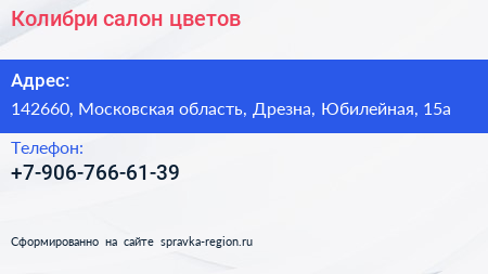 Колибри, салон цветов по адресу 142660, Московская область, Дрезна, Юбилейная, 15а в дальнейшем Организация, размещена в следующих категориях: