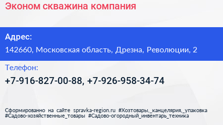 Эконом скважина, компания по адресу 142660, Московская область, Дрезна, Революции, 2 в дальнейшем Организация, размещена в следующих категориях:
