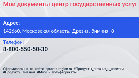 Мои документы, центр государственных услуг по адресу 142660, Московская область, Дрезна, Зимина, 8 в дальнейшем Организация, размещена в следующих категориях: