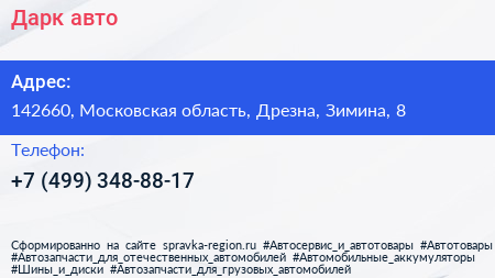 Дарк авто по адресу 142660, Московская область, Дрезна, Зимина, 8 в дальнейшем Организация, размещена в следующих категориях: