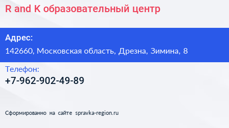 R and K, образовательный центр по адресу 142660, Московская область, Дрезна, Зимина, 8 в дальнейшем Организация, размещена в следующих категориях:
