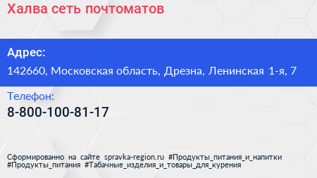 Халва, сеть почтоматов по адресу 142660, Московская область, Дрезна, Ленинская 1-я, 7 в дальнейшем Организация, размещена в следующих категориях: