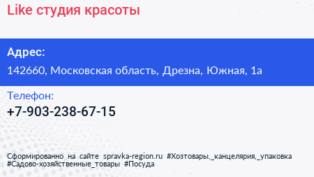 Like, студия красоты по адресу 142660, Московская область, Дрезна, Южная, 1а в дальнейшем Организация, размещена в следующих категориях:
