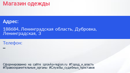Магазин одежды по адресу 188684, Ленинградская область, Дубровка, Ленинградская, 3 в дальнейшем Организация, размещена в следующих категориях:
