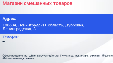 Магазин смешанных товаров по адресу 188684, Ленинградская область, Дубровка, Ленинградская, 3 в дальнейшем Организация, размещена в следующих категориях: