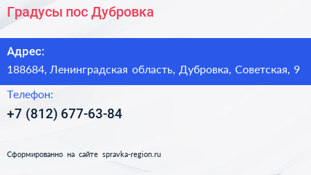 Градусы, пос. Дубровка по адресу 188684, Ленинградская область, Дубровка, Советская, 9 в дальнейшем Организация, размещена в следующих категориях: