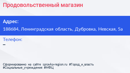 Продовольственный магазин по адресу 188684, Ленинградская область, Дубровка, Невская, 5а в дальнейшем Организация, размещена в следующих категориях: