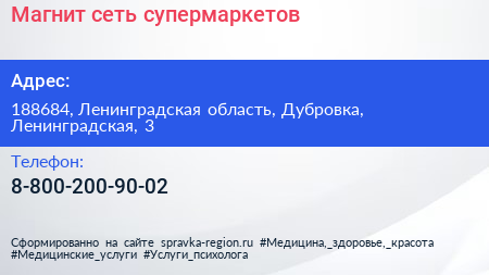 Магнит, сеть супермаркетов по адресу 188684, Ленинградская область, Дубровка, Ленинградская, 3 в дальнейшем Организация, размещена в следующих категориях: