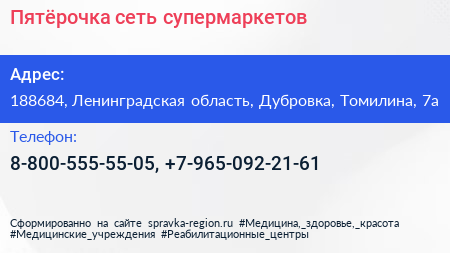 Пятёрочка, сеть супермаркетов по адресу 188684, Ленинградская область, Дубровка, Томилина, 7а в дальнейшем Организация, размещена в следующих категориях:
