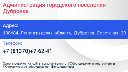 Администрация городского поселения Дубровка по адресу 188684, Ленинградская область, Дубровка, Советская, 33 в дальнейшем Организация, размещена в следующих категориях: