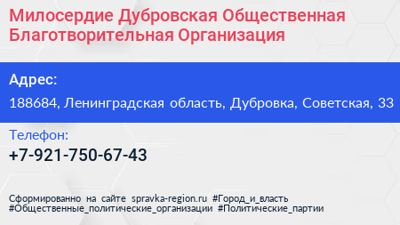 Милосердие, Дубровская Общественная Благотворительная Организация по адресу 188684, Ленинградская область, Дубровка, Советская, 33 в дальнейшем Организация, размещена в следующих категориях: