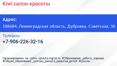 Kiwi, салон красоты по адресу 188684, Ленинградская область, Дубровка, Советская, 36 в дальнейшем Организация, размещена в следующих категориях: