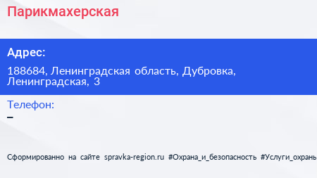 Парикмахерская по адресу 188684, Ленинградская область, Дубровка, Ленинградская, 3 в дальнейшем Организация, размещена в следующих категориях: