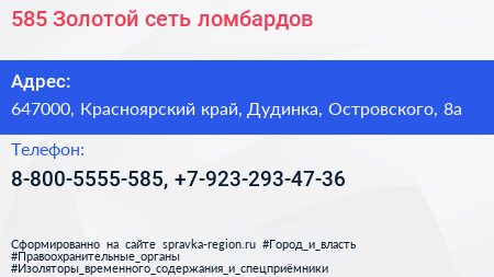 585*Золотой, сеть ломбардов по адресу 647000, Красноярский край, Дудинка, Островского, 8а в дальнейшем Организация, размещена в следующих категориях: