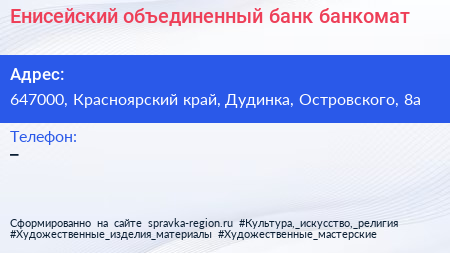 Енисейский объединенный банк, банкомат по адресу 647000, Красноярский край, Дудинка, Островского, 8а в дальнейшем Организация, размещена в следующих категориях: