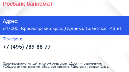 Росбанк, банкомат по адресу 647000, Красноярский край, Дудинка, Советская, 43 к1 в дальнейшем Организация, размещена в следующих категориях: