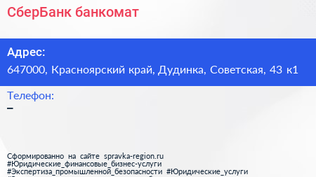 СберБанк, банкомат по адресу 647000, Красноярский край, Дудинка, Советская, 43 к1 в дальнейшем Организация, размещена в следующих категориях: