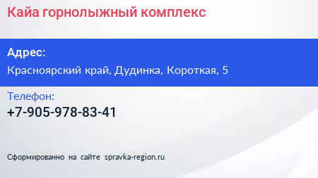 Кайа, горнолыжный комплекс по адресу Красноярский край, Дудинка, Короткая, 5 в дальнейшем Организация, размещена в следующих категориях: