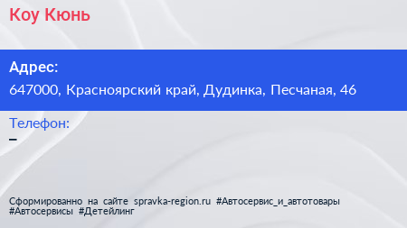 Коу-Кюнь по адресу 647000, Красноярский край, Дудинка, Песчаная, 46 в дальнейшем Организация, размещена в следующих категориях: