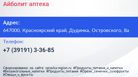 Айболит, аптека по адресу 647000, Красноярский край, Дудинка, Островского, 8а в дальнейшем Организация, размещена в следующих категориях: