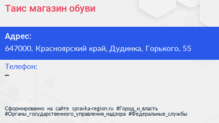 Таис, магазин обуви по адресу 647000, Красноярский край, Дудинка, Горького, 55 в дальнейшем Организация, размещена в следующих категориях: