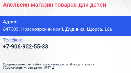 Апельсин, магазин товаров для детей по адресу 647005, Красноярский край, Дудинка, Щорса, 16а в дальнейшем Организация, размещена в следующих категориях: