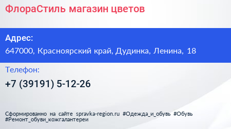 ФлораСтиль, магазин цветов по адресу 647000, Красноярский край, Дудинка, Ленина, 18 в дальнейшем Организация, размещена в следующих категориях: