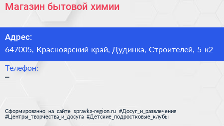 Магазин бытовой химии по адресу 647005, Красноярский край, Дудинка, Строителей, 5 к2 в дальнейшем Организация, размещена в следующих категориях: