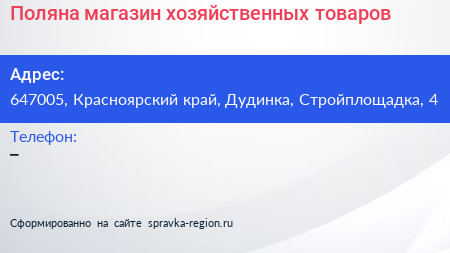 Поляна, магазин хозяйственных товаров по адресу 647005, Красноярский край, Дудинка, Стройплощадка, 4 в дальнейшем Организация, размещена в следующих категориях: