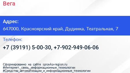 Вега+ по адресу 647000, Красноярский край, Дудинка, Театральная, 7 в дальнейшем Организация, размещена в следующих категориях: