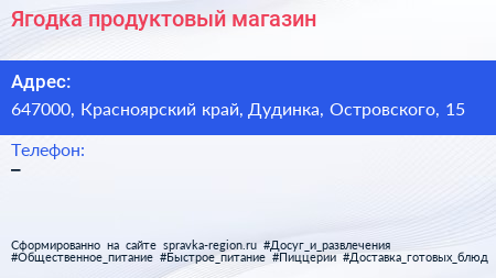 Ягодка, продуктовый магазин по адресу 647000, Красноярский край, Дудинка, Островского, 15 в дальнейшем Организация, размещена в следующих категориях: