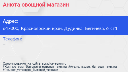 Анюта, овощной магазин по адресу 647000, Красноярский край, Дудинка, Бегичева, 6 ст1 в дальнейшем Организация, размещена в следующих категориях: