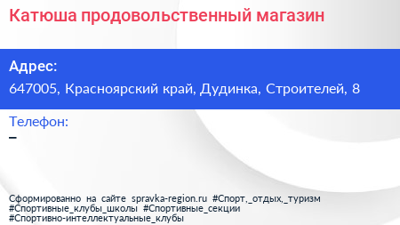 Катюша, продовольственный магазин по адресу 647005, Красноярский край, Дудинка, Строителей, 8 в дальнейшем Организация, размещена в следующих категориях: