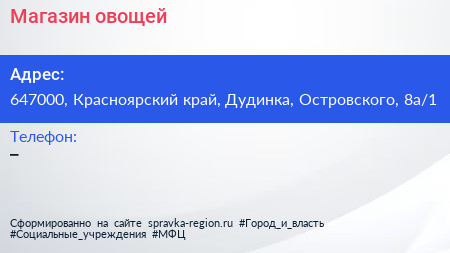 Магазин овощей по адресу 647000, Красноярский край, Дудинка, Островского, 8а/1 в дальнейшем Организация, размещена в следующих категориях: