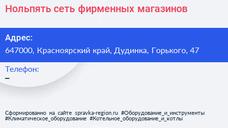 Нольпять, сеть фирменных магазинов по адресу 647000, Красноярский край, Дудинка, Горького, 47 в дальнейшем Организация, размещена в следующих категориях: