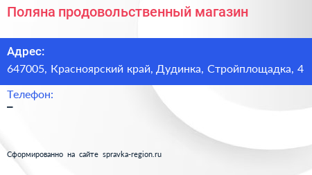 Поляна, продовольственный магазин по адресу 647005, Красноярский край, Дудинка, Стройплощадка, 4 в дальнейшем Организация, размещена в следующих категориях: