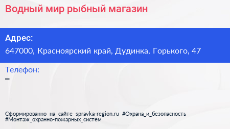 Водный мир, рыбный магазин по адресу 647000, Красноярский край, Дудинка, Горького, 47 в дальнейшем Организация, размещена в следующих категориях: