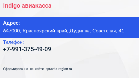 Indigo, авиакасса по адресу 647000, Красноярский край, Дудинка, Советская, 41 в дальнейшем Организация, размещена в следующих категориях: