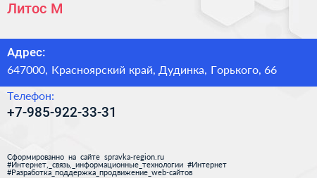 Литос М по адресу 647000, Красноярский край, Дудинка, Горького, 66 в дальнейшем Организация, размещена в следующих категориях:
