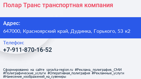 Полар Транс, транспортная компания по адресу 647000, Красноярский край, Дудинка, Горького, 53 к2 в дальнейшем Организация, размещена в следующих категориях: