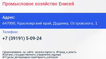 Промысловое хозяйство Енисей по адресу 647000, Красноярский край, Дудинка, Островского, 1 в дальнейшем Организация, размещена в следующих категориях: