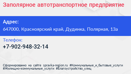 Заполярное автотранспортное предприятие по адресу 647000, Красноярский край, Дудинка, Полярная, 13а в дальнейшем Организация, размещена в следующих категориях: