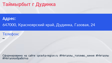 Таймырбыт, г. Дудинка по адресу 647000, Красноярский край, Дудинка, Газовая, 24 в дальнейшем Организация, размещена в следующих категориях: