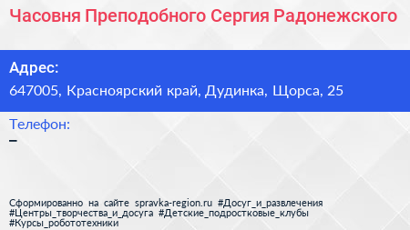 Часовня Преподобного Сергия Радонежского по адресу 647005, Красноярский край, Дудинка, Щорса, 25 в дальнейшем Организация, размещена в следующих категориях: